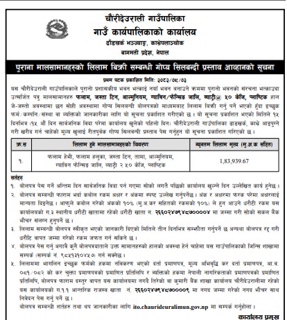 पुराना मालसामानहरुको लिलाम विक्रि सम्बन्धी सिलबन्धी प्रस्तावको सूचना ।